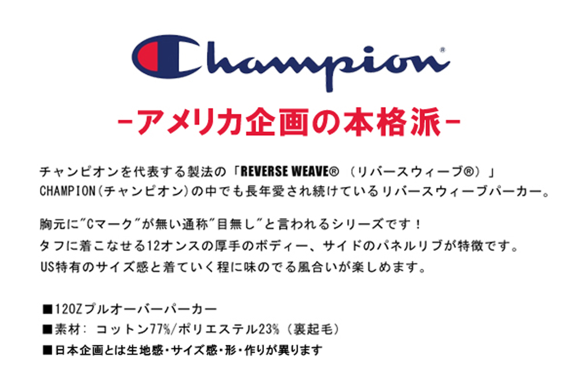 1919年、ニューヨーク州ロチェスターで誕生し、優れた運動性能と耐久性を誇る、「スウェットシャツ」が米軍学校の訓練用ウェアに採用されました。以後、チャンピオンは、カレッジやプロのアスリート達に育てられ、全幅の信頼を獲得してきました。常にアスリートの立場で考え、新しいものを追求する精神(=Champion 1st)をウェアに宿してきました。チャンピオンは、「キング・オブ・スウェットシャツ」の称号でも呼ばれるブランドです。つまり、スウェットシャツを代表するブランドとして有名です。特に、「リバースウィーブ」というスウェットシャツが人気を持っています。