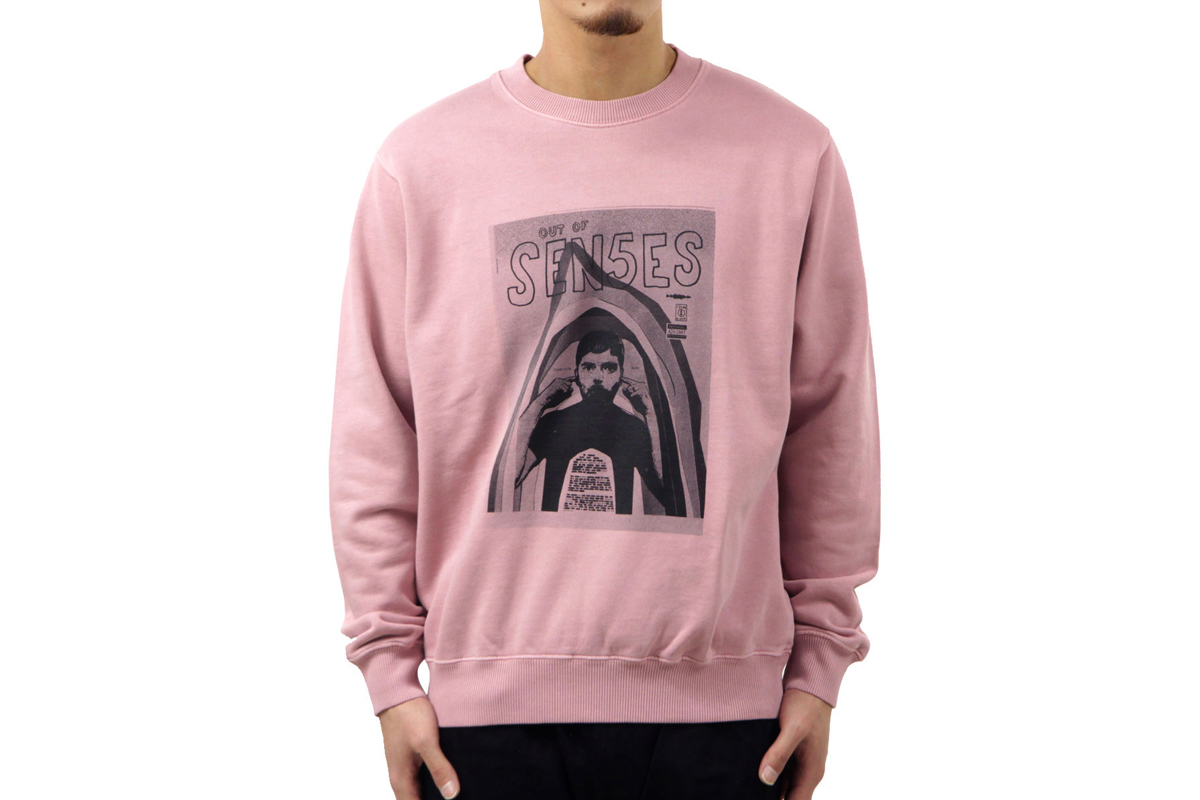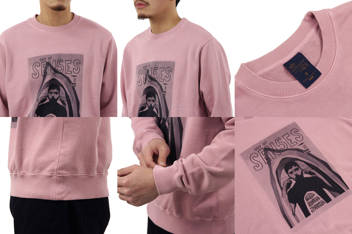 NUDIE JEANSからアートとファッションを融合させた「Lasse」シリーズよりクルーネックスウェットのご紹介です。フロントには独創的なグラフィック「OUT OF SENSES」のタイポグラフィと、耳を塞ぐ人物のモノクロアートが大胆にプリントされています。これは雑誌の表紙ISSUE 2を彷彿とさせるデザインで、ブランドのクリエイティブな側面を強調しています。そして「Paper Pink」と名付けられたこのカラーは、鮮やかすぎず、どこかヴィンテージ感のある落ち着いたピンク色が特徴です。