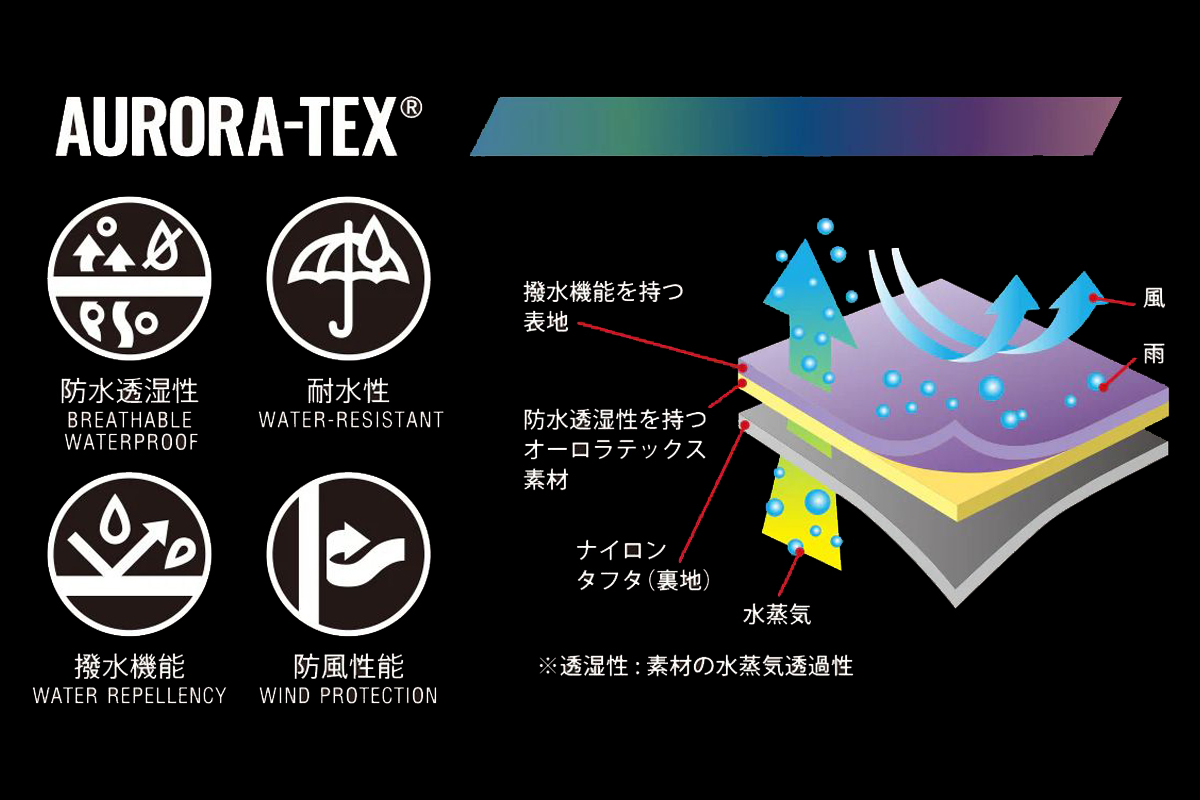 ナンガ独自の多孔質ポリウレタン防水コーティング加工を施したナイロン生地。雨などの水を通さず、内部の蒸れを逃がすため、天候の変わりやすいアウトドアシーンでも安心です。
