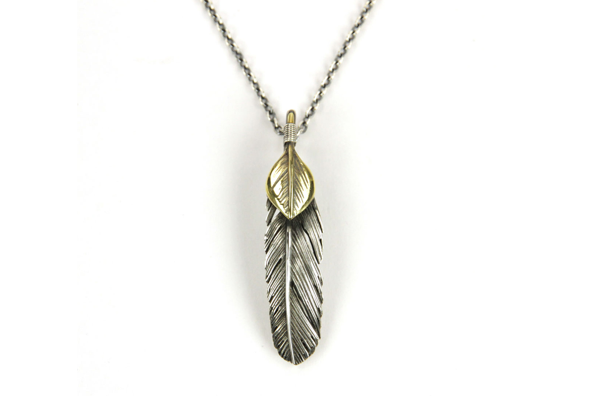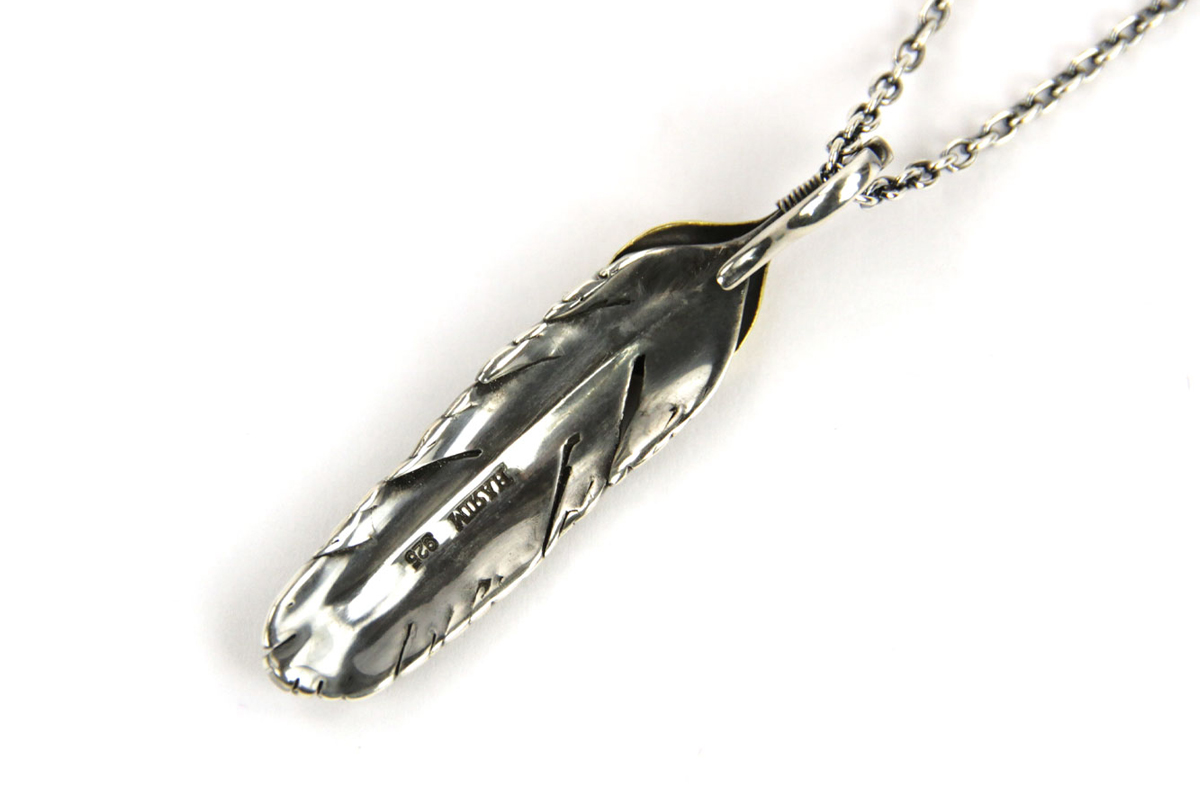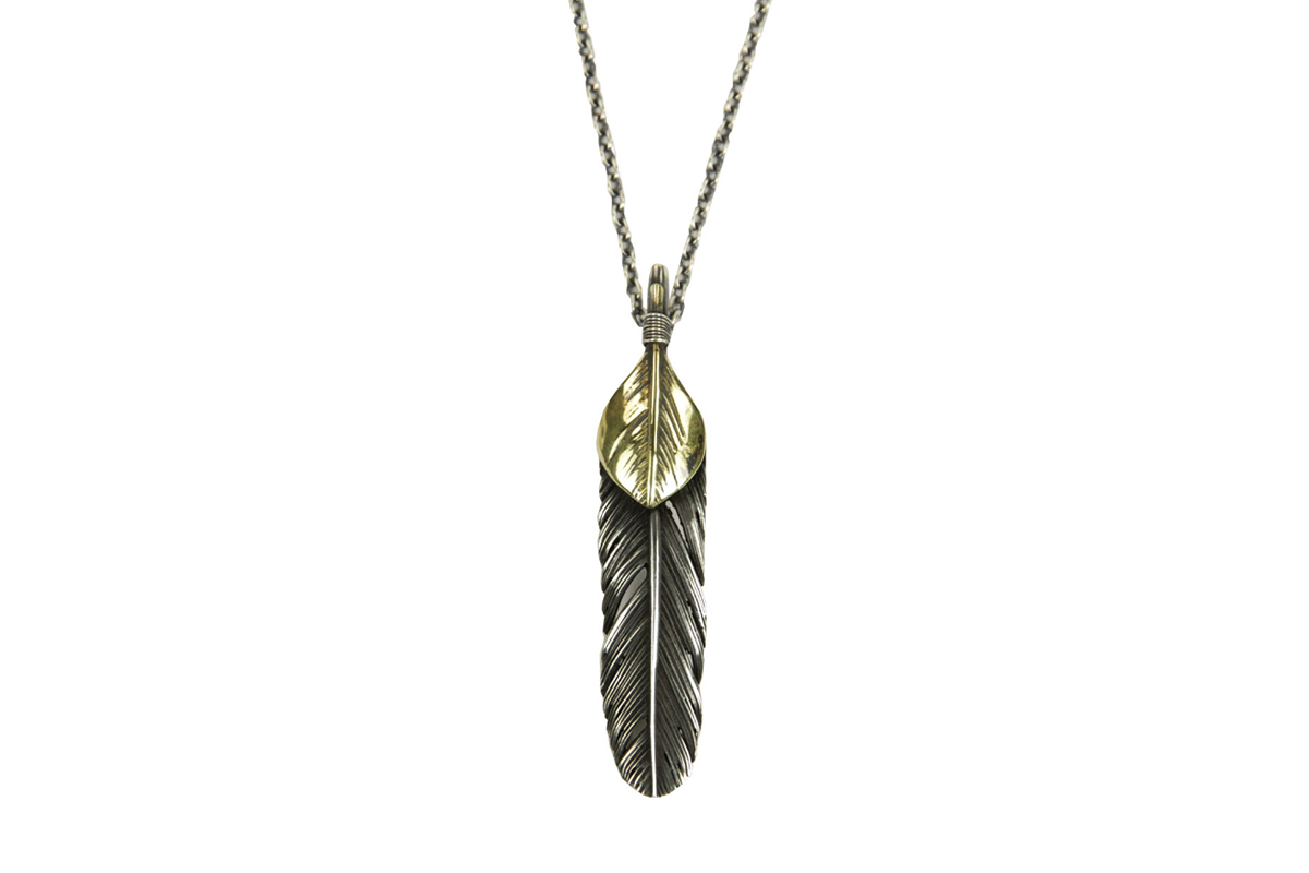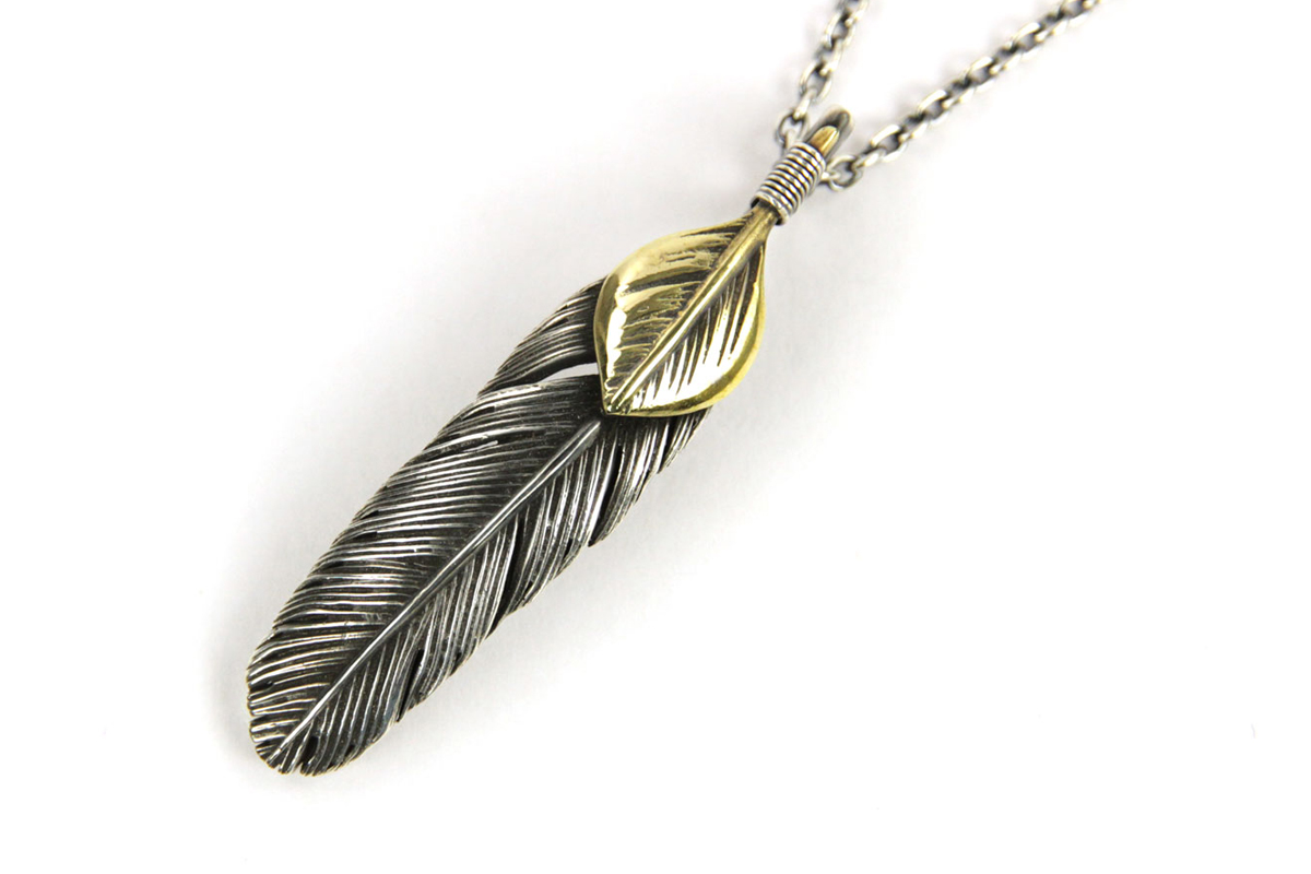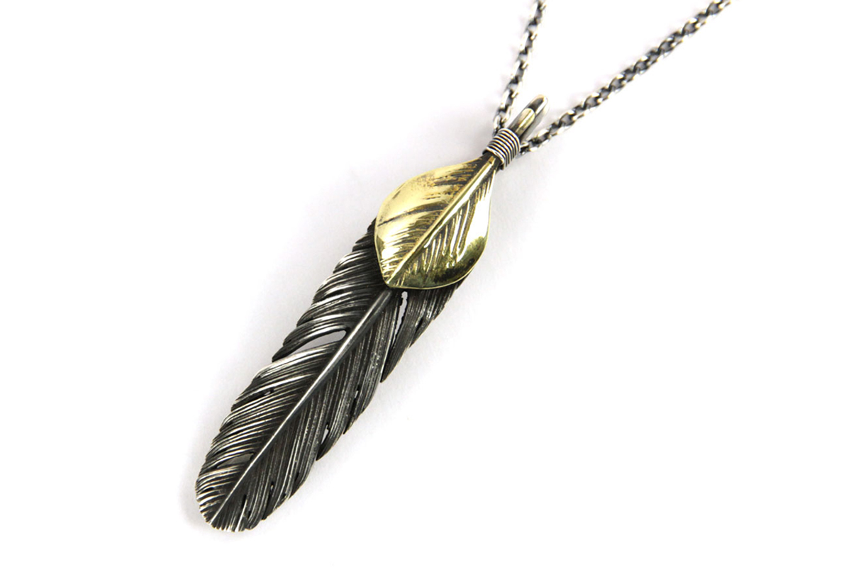 無骨さと繊細さが共存する、HARIMならではの世界観を体現した「FEATHER CENTER S」シリーズからカスタムネックレスセットのご紹介です。シルバーの重厚感とブラス(真鍮)の温かみが絶妙に融合し、ヴィンテージライクで奥行きのある表情を楽しめる一本に仕上がっています。メインとなるフェザーモチーフには、SILVER 925を採用。羽の一本一本まで丁寧に彫り込まれたディテールは、熟練した職人の手仕事によるもの。さらにOX(オキシダイズド)加工を施すことで陰影が強調され、立体感と深みを演出。使い込むほどに風合いが増し、経年変化によるエイジングも魅力のひとつです。本モデルは「SPBR(シルバー×ブラス)」仕様のカスタムデザインとなっており、ブラスパーツが加わることで無骨な中にも柔らかなニュアンスをプラス。シルバー単体とは異なるコントラストが生まれ、より存在感のある仕上がりになっています。派手すぎず、それでいてしっかりと主張する絶妙なバランス感は、スタイリングのアクセントとして非常に優秀です。