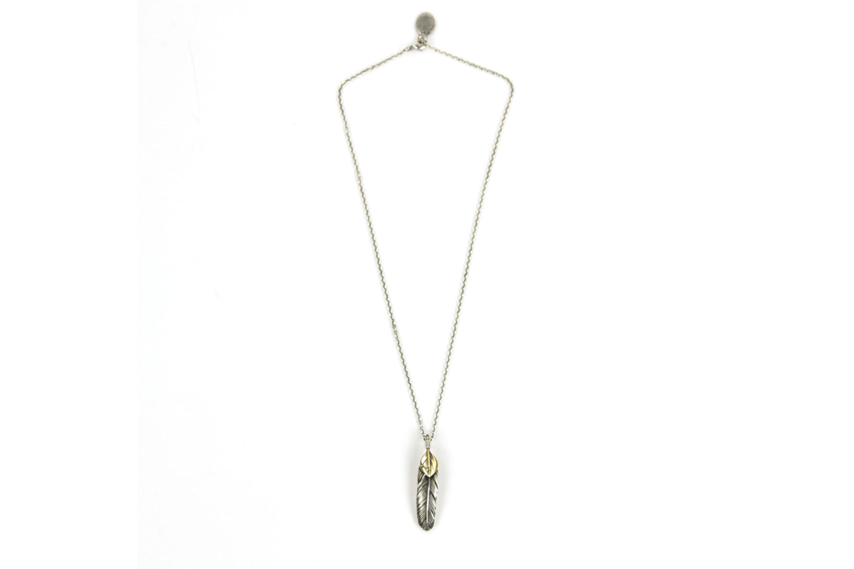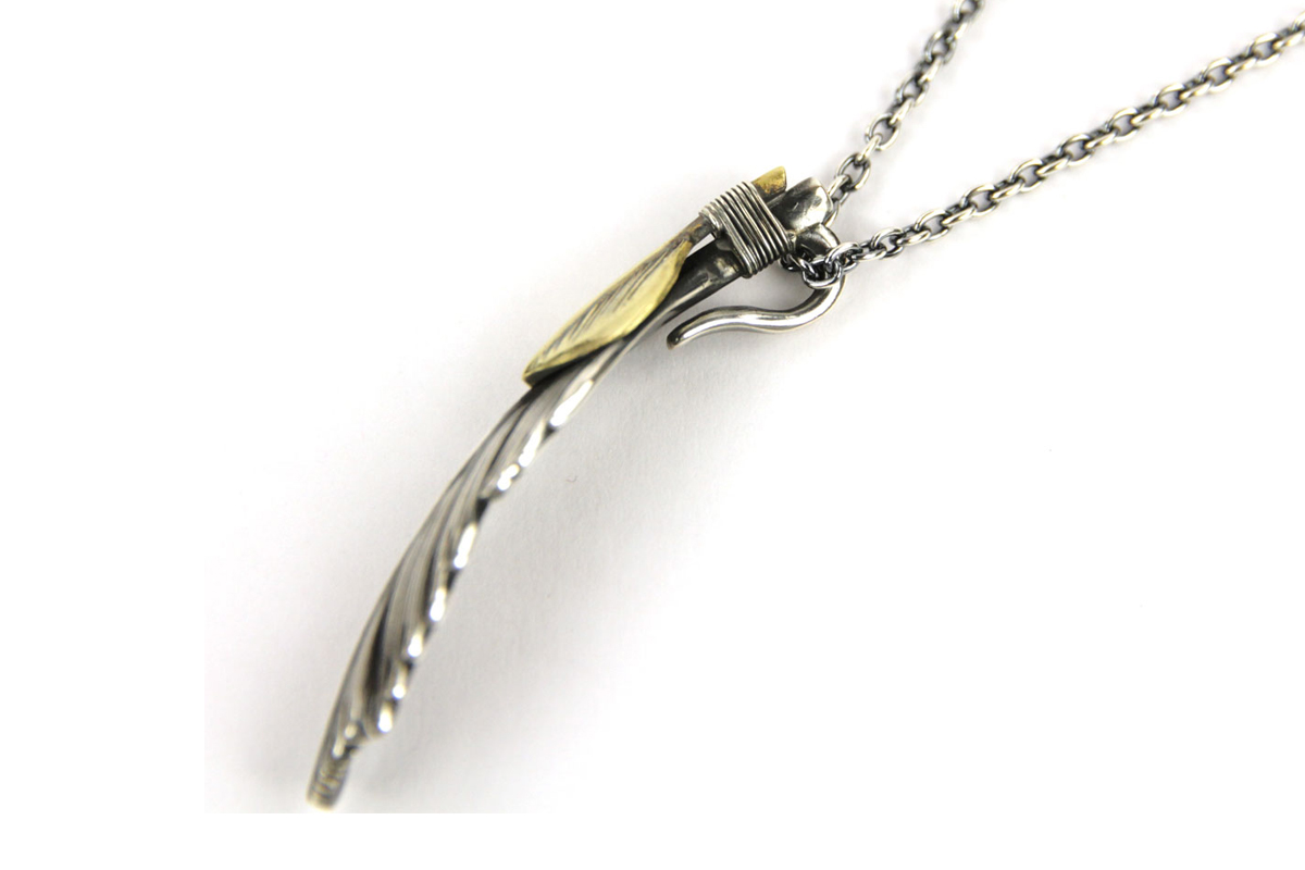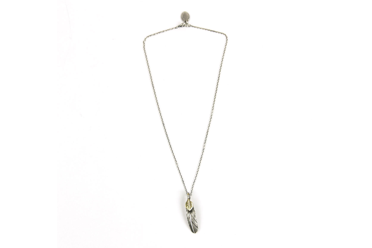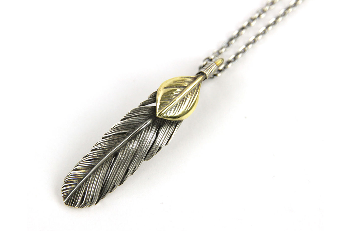 無骨さと繊細さが共存する、HARIMならではの世界観を体現した「FEATHER CENTER S」シリーズからカスタムネックレスセットのご紹介です。シルバーの重厚感とブラス(真鍮)の温かみが絶妙に融合し、ヴィンテージライクで奥行きのある表情を楽しめる一本に仕上がっています。メインとなるフェザーモチーフには、SILVER 925を採用。羽の一本一本まで丁寧に彫り込まれたディテールは、熟練した職人の手仕事によるもの。さらにOX(オキシダイズド)加工を施すことで陰影が強調され、立体感と深みを演出。使い込むほどに風合いが増し、経年変化によるエイジングも魅力のひとつです。本モデルは「SPBR(シルバー×ブラス)」仕様のカスタムデザインとなっており、ブラスパーツが加わることで無骨な中にも柔らかなニュアンスをプラス。シルバー単体とは異なるコントラストが生まれ、より存在感のある仕上がりになっています。派手すぎず、それでいてしっかりと主張する絶妙なバランス感は、スタイリングのアクセントとして非常に優秀です。