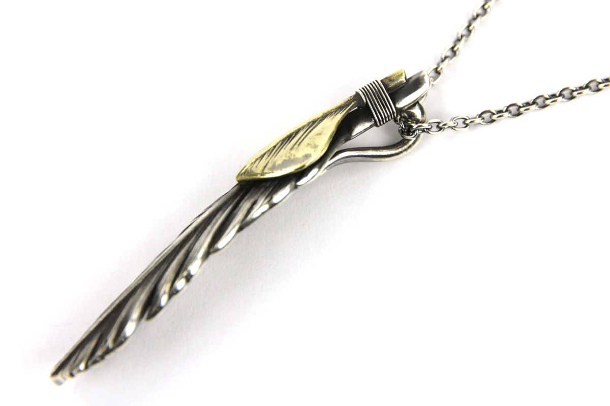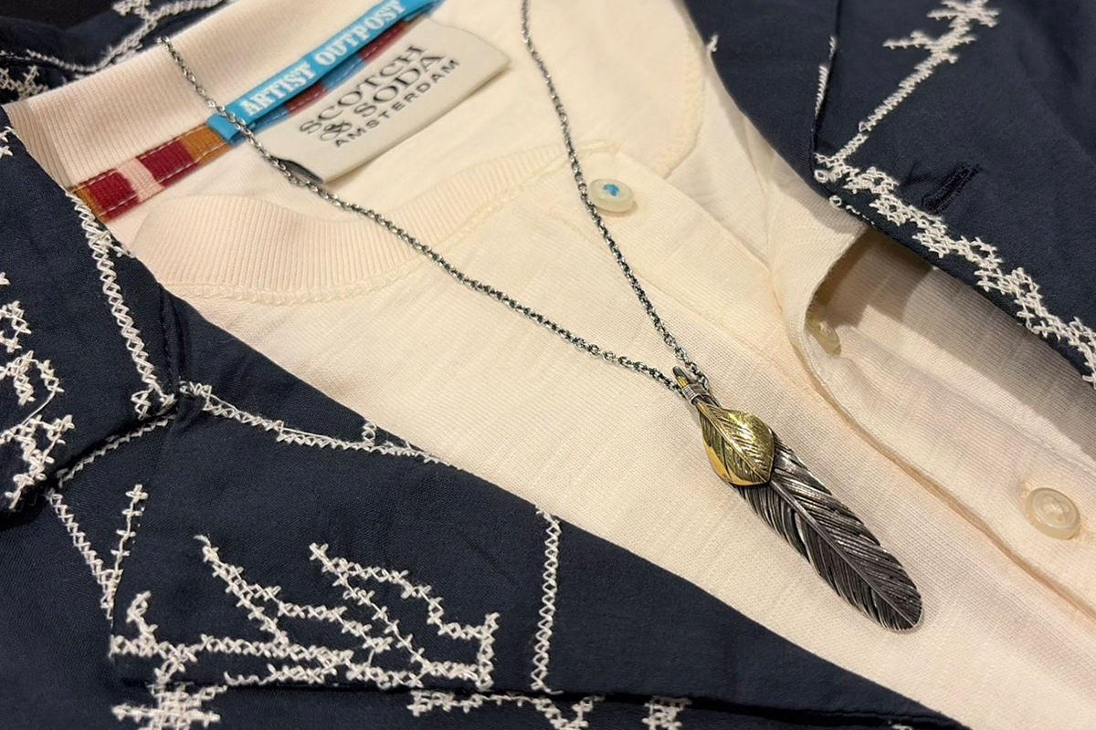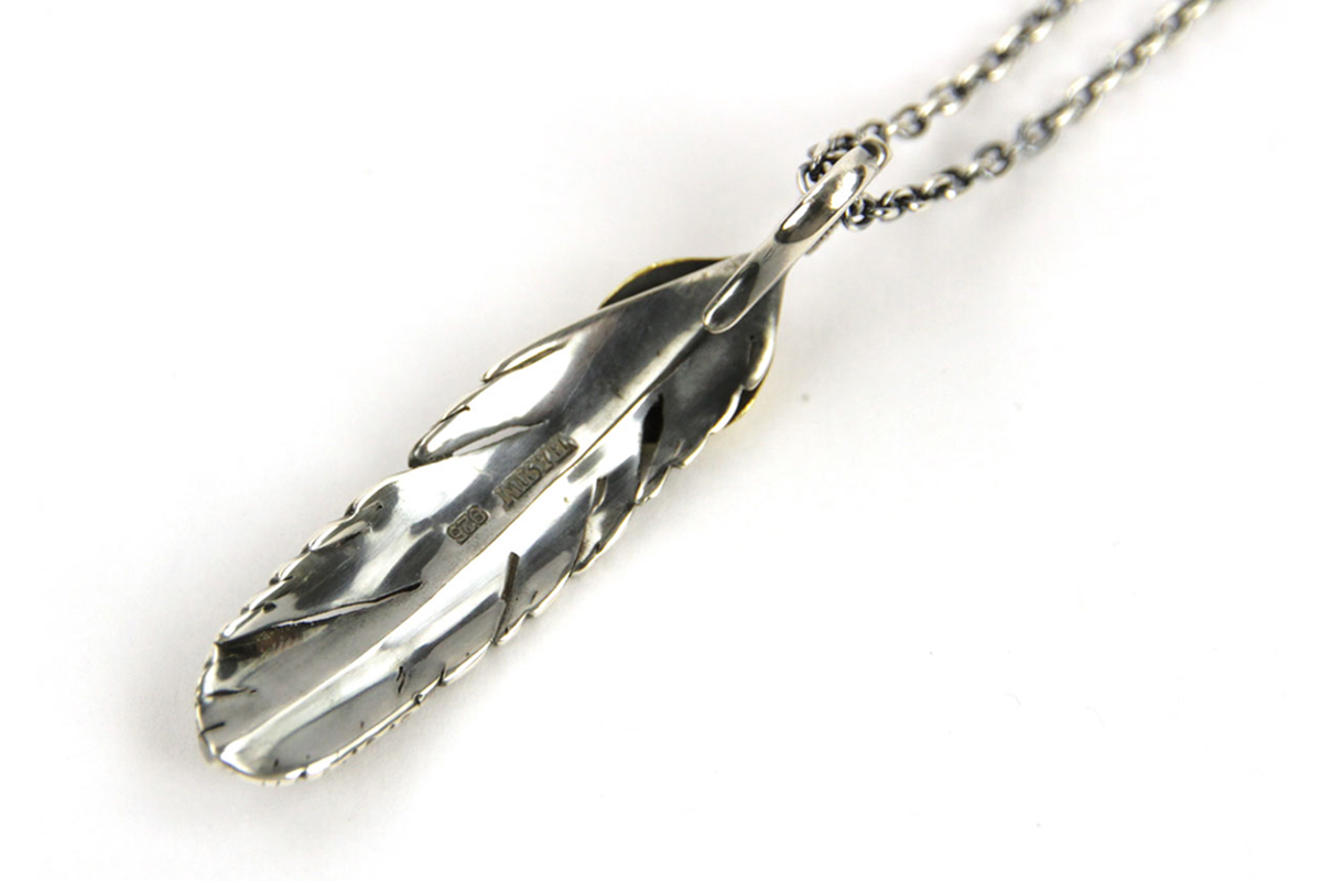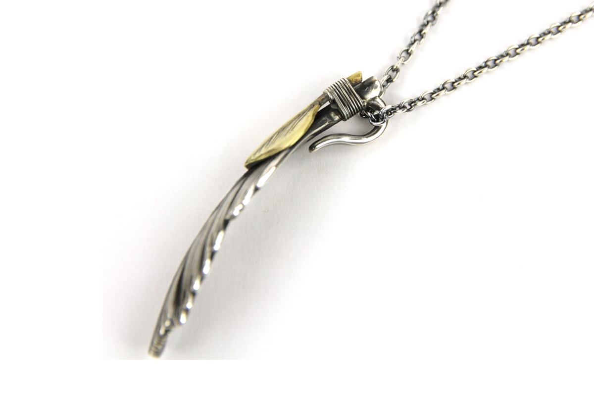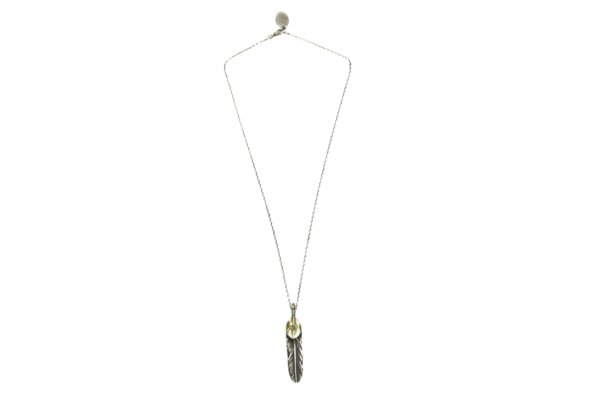 無骨さと繊細さが共存する、HARIMならではの世界観を体現した「FEATHER CENTER S」シリーズからカスタムネックレスセットのご紹介です。シルバーの重厚感とブラス(真鍮)の温かみが絶妙に融合し、ヴィンテージライクで奥行きのある表情を楽しめる一本に仕上がっています。メインとなるフェザーモチーフには、SILVER 925を採用。羽の一本一本まで丁寧に彫り込まれたディテールは、熟練した職人の手仕事によるもの。さらにOX(オキシダイズド)加工を施すことで陰影が強調され、立体感と深みを演出。使い込むほどに風合いが増し、経年変化によるエイジングも魅力のひとつです。本モデルは「SPBR(シルバー×ブラス)」仕様のカスタムデザインとなっており、ブラスパーツが加わることで無骨な中にも柔らかなニュアンスをプラス。シルバー単体とは異なるコントラストが生まれ、より存在感のある仕上がりになっています。派手すぎず、それでいてしっかりと主張する絶妙なバランス感は、スタイリングのアクセントとして非常に優秀です。